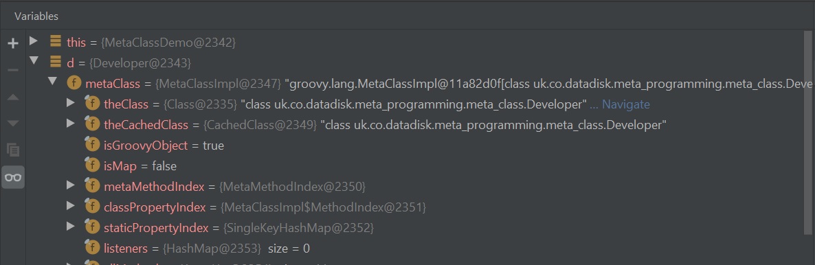 The Groovy metaClass lets you assign behavior and state to Classes at runtime without editing the original source code, it's a layer above the original Class. If you create a class in Groovy and instantiate you have a proerty attached called a metaClass as seen in the image below, so you can access this by using d.metaClass