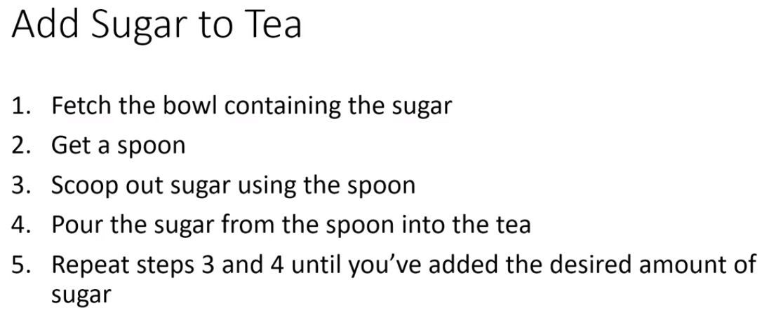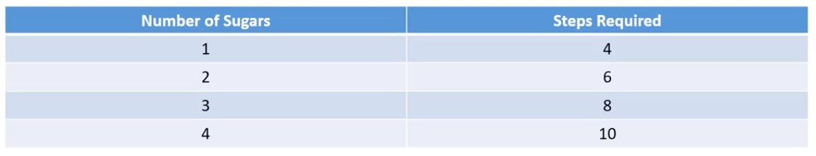 Using the example of adding sugar to a cup of tea, the number of steps increases the more sugars you want (right-hand screenshot) and thus the time complexity also increases.