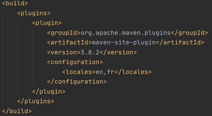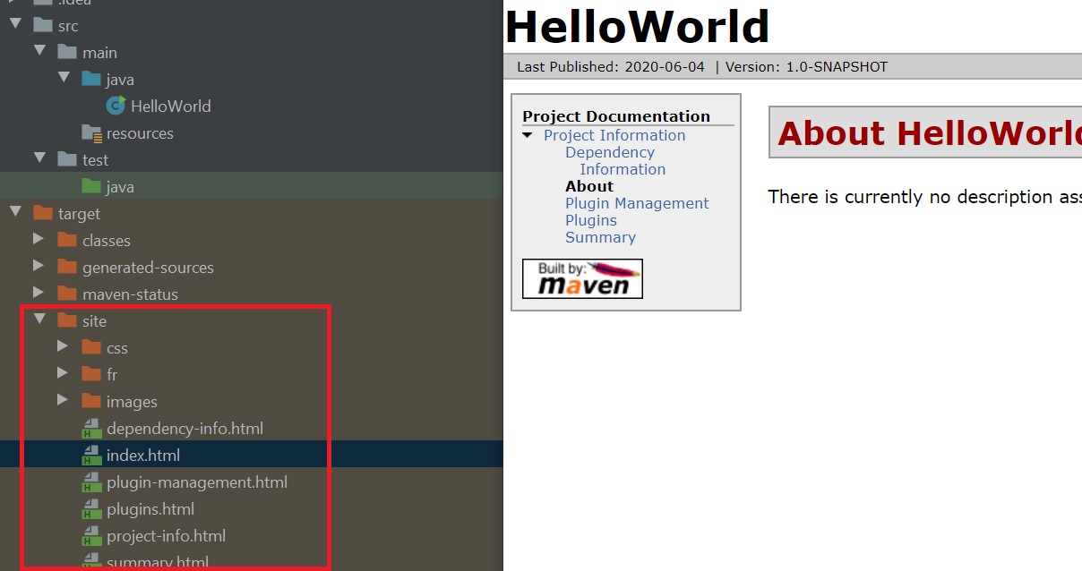 The Site plugin creates a website for you to view the documenation for your project, you have some options for eample you can add additional languages, if you look at the screenshot on the right you can see that the website is created in the target directory, the website uses very basic HTML.