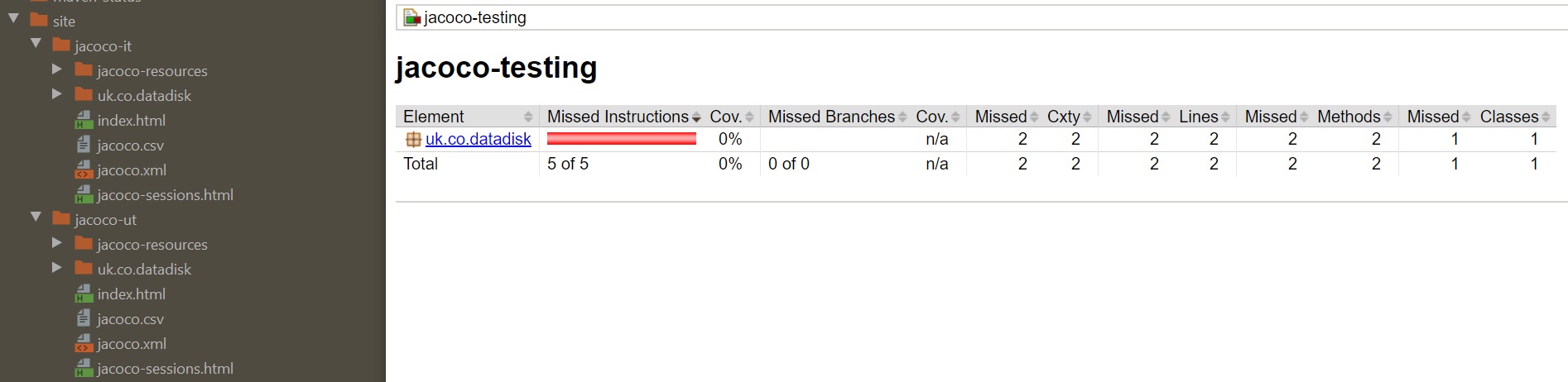 When you run verify the jacoco directories (jacoco-it and jacoco-ut) will be created in the target/site directory, looking at the index.html you can see that I don't have much testing coverage.