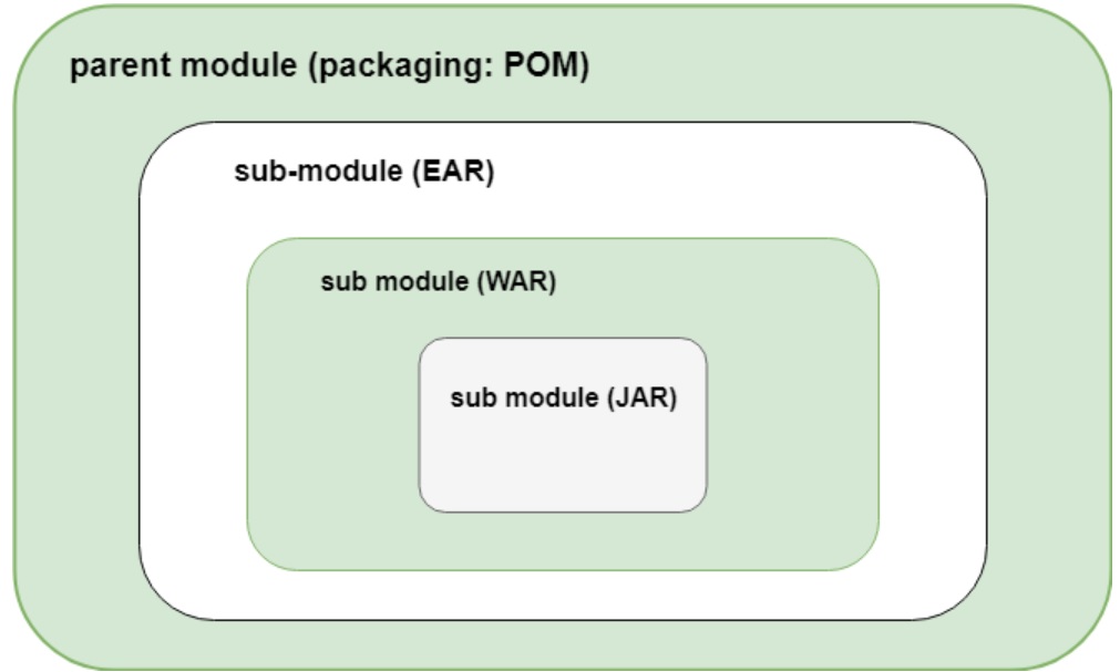 Once you get into Enterprise applications there will be many modules and Maven can handle this and this is what this section is all about. In Maen you have a parent POM which normally has a packaging of POM, this POM will be accessed (inherited) by all the other modules in the project and contain global properties that can be used by other POM's. As you can see in the below diagram sub-modules (children) can also inherit form other sub-modules, there is no limit to this but again don't make things to complex. Each module is in affect a project, each project (module or sub-module) will have its own POM file and can inherit up stream to the upper most POM file.
