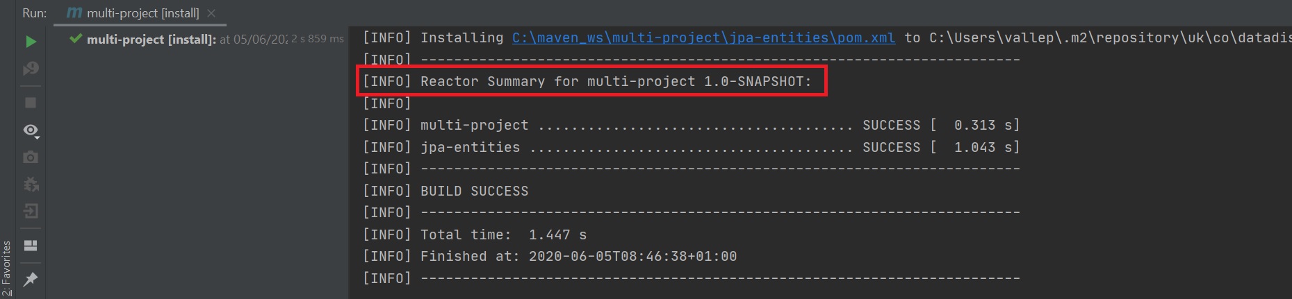 Finally when you run the install lifecycle on the parent POM you can clear see the reactor coming into play, you can see the two modules.