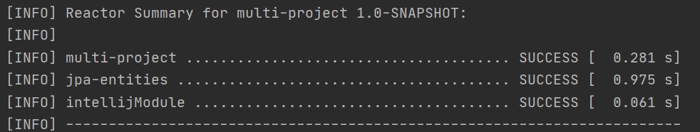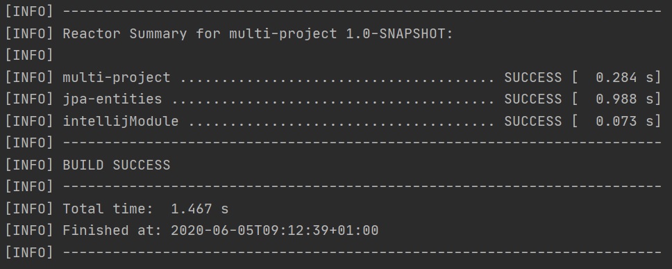 Intellij also updated the parent POM to include the new module and now when you run the install lifecycle the reactor picks it up, we can now see three modules (including the parent). Notice the reactor order is as per the modules order in the parent POM file.