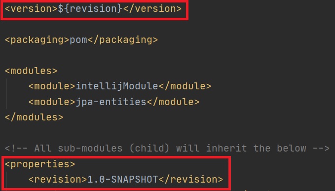 There is a flatten Maven plugin which allows you to replace the ${revision} in the repository code with the correct version value, if you notice in the repository pom file the ${revision} has not been replaced, you can use the flatten plugin to do this. You use the dependencyManagement to declare the dependencies in the whole project (left screenshot), then you declare the specific dependencies for each module (right screenshot), however you can obmit the version as this will be picked by the dependencyManagement.