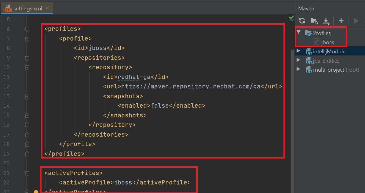 As stated above you can setup a build profile in one of three ways this example uses the settings.xml file. Intellij will list the profiles and indicate whichs ones are active.