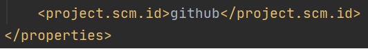 First we add a propery called project.scm.id that points to the settimgs.xml git setup (see below), then we add the scm element (right-hand screenshot), all three pieces allows you to connect to github for source control management.