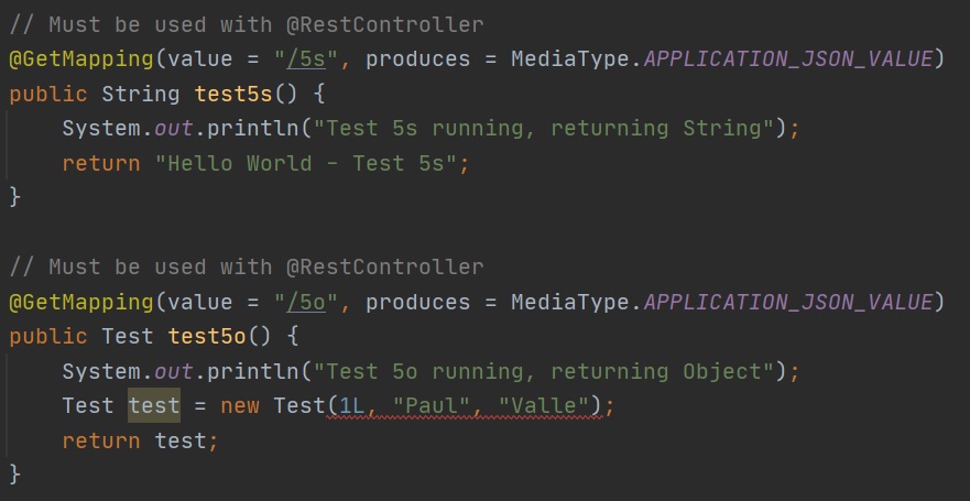I have a few examples of each of the API implmentation for the above to explain each one in more detail, first we start with a plain old method, to get it to work with @Controller (left-hand screenshot) you need to use the @ResponseBody annotation, you can also optionally use the @ResponseStatus annotation as well. If using the @RestController (right-hand screenshot, which is actually @Controller and @ResponseBody) you can reduce the code a little. I have given examples of using both returning a String and an Custom object.
