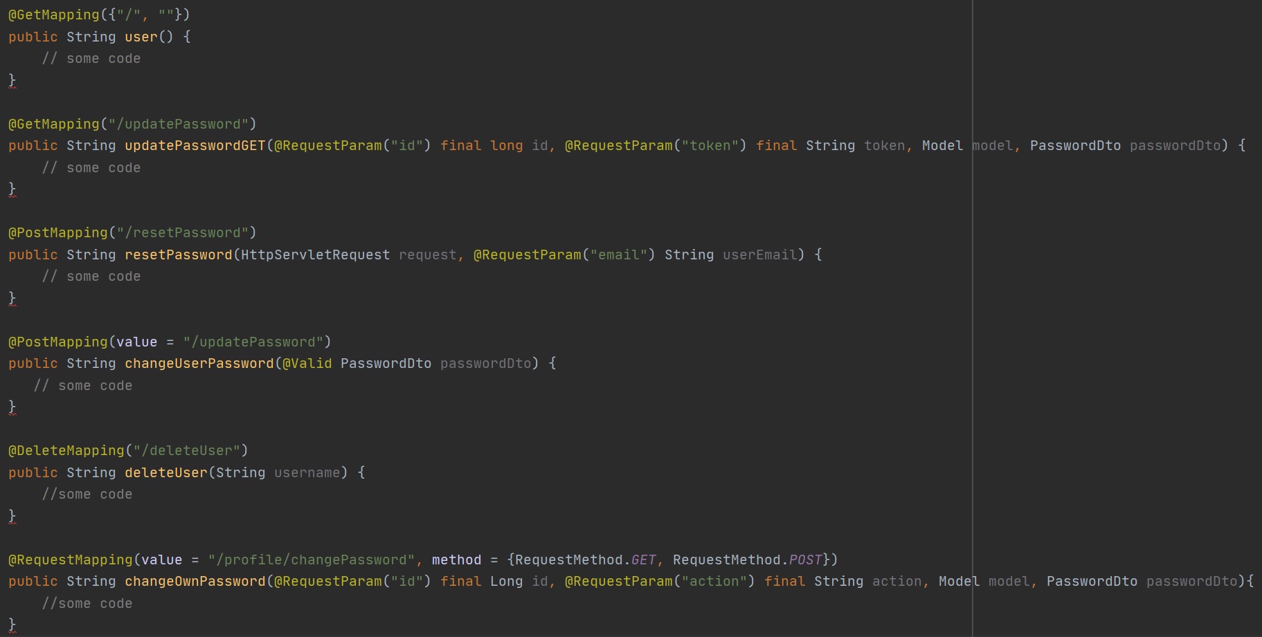 Below are some examples of using the annotations, at the moment just focus on the annotation, you can see that I have used specific annotations (@GetMapping, @PostMapping) and a generic mapping (@RequestMapping), basically when the clients web browser sends a HTTP request Spring Boot will look at the URL and the HTTP method and route to the specific method. For example taking the top example all traffic with http://localhost:8080/ using the GET method will invoke the top method, in the second example all traffic with http://localhost:8080/updatePassword using the GET method will invoke the second method, etc. The Generic @RequestMapping routes traffic from http://localhost:8080/profile/changePassword using either HTTP GET or POST methods.