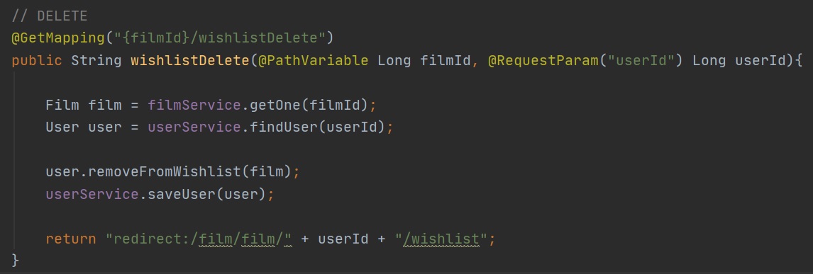 The other way to pass data is a Request Parameter so for example the URL http://localhost/film/1/wishListDelete?userId=1, here we use the annotation @RequestParam to map the parameter sent to the Long userId object and then can then use this inside the method. You can mix and match @PathVariable and @RequestParam as in the example below.