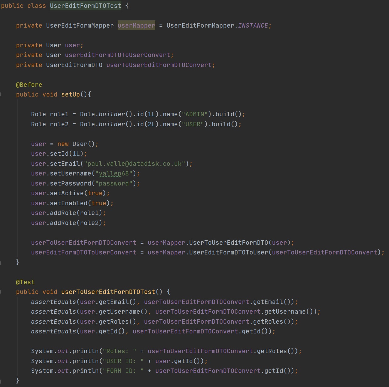 The UserEditForm DTO (left-side screenshot) maps to the User object and is a simple POJO and if you notice you can also use Lombok, you can leave out any fields that you don't want to use for example the password field. The DTO object can then be used between the presentation layer and the service layer securely. In the MapStruct interface we start with the @Mapper annotation, this marks the interface as a mapping interface and lets the MapStruct processor kick in during compilation. We then have two methods to map in both directions DTO to Object and Object to DTO, the source of the object is passed as a parameter. There are times where you might need a type convertion as you can see in the example I have one for the dateCreated field from String to MySQL date format. To use Spring IoC in our mapper(dependency injection), we need to add the componentModel attribute to @Mapper with the value spring.