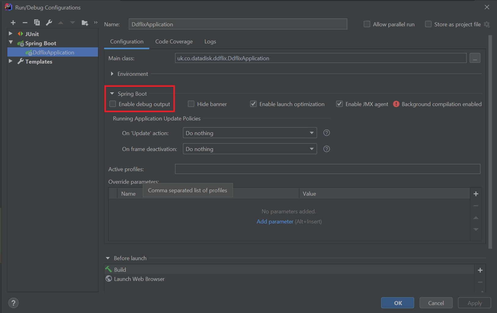 Most IDE's have a debug option in regards to Spring Boot, below you can see Intellij's debug option for Spring Boot, setting this option allows you to see alot of debugging information, including JPA, Seecurity, etc.