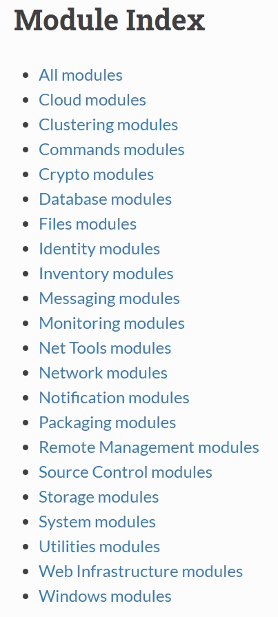 In this Ansible cheatsheet I have a page with all the playbooks, plus below I detail these files and the various options. Its best you use the Ansible documentation to see if any modules have been updated or any new modules have been created, below is just some of the highlights of what Ansible can do. You can also use the Ansible Galaxy website to see what others have created in regards to roles.