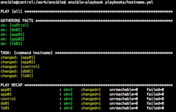 Playbook example (basic (YAML)) | --- - hosts: all tasks: - name: get server hostname command: hostname |