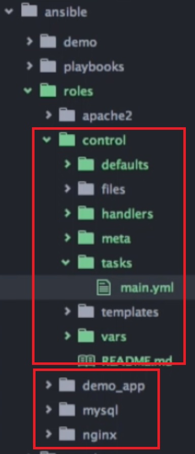 The directory structure will look something like below, you can see that I have created a directory structure for each part of the project (control, nginx, mysql, app, etc), you can create what ever structure you like based on what you will be using Ansible for.