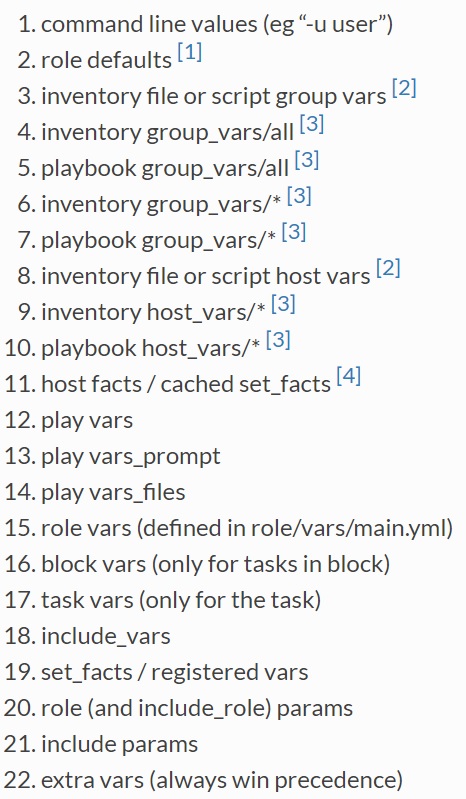 Ansible has variable precedence as can be seen below which is taken from the Ansible documentation, the top of the list has the lowest priority and the bottom of the list has the highest priority. You can include variables inside the playbooks (site level, playbook top level, etc) but try to keep things simple.