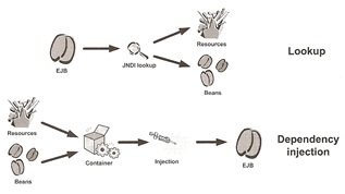 Almost every component uses another component or a resource to implement functionality, the main aim of Dependency Injection (DI) is make it as loosely coupled as possible, which means that one component should call another component or resource only through an interface and that components and resources should be glued together using configuration instead of code. In EJB 2 a JNDI lookup involved hard coding resource names into the bean, with DI the container reads the target bean configuration and figures out what beans and resources the target bean needs and injects them into the bean at runtime. DI allows you to declare component dependencies but lets the container deal with the complexities of service or resource instantiation, initialization, sequencing and supplies the service or resource references to the clients as required, @EJB will inject EJBs, @Resource will inject JMS resources, @PersistenceContext will inject container-managed EntityManager.