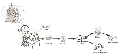 The above diagram represents a traditional four tier architecture, only two processes are triggered by the user, adding a bid to an item and ordering items won. The below is we are planning on using for each part of the application