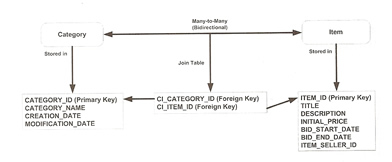 Many-To-Many | @Entity @Table(name="CATEGORIES") public class category implements Serializable { @Id @Column(name="CATEGORY_ID") protected Long categoryId; // joinColumns - describes the owning relationship // inverseJoinColumns - describes the subordinate relationship @ManyToMany @JoinTable(name="CATEGORY_ITEMS", joinColumns(name="CI_CATEGORY_ID", referencedColumnName="CATEGORY_ID"), inverseJoinColumns= @JoinColumn(name="CI_ITEM_ID", referencedColumnName="ITEM_ID" ) ) protected Set<Item> item; ... } @Entity @Table(name="ITEMS") public class Item implements Serializable { @Id @Column(name="ITEM_ID") protected Long itemId; ... @ManyToMany(mappedBy="item") protected Set<Category> categories; ... } |