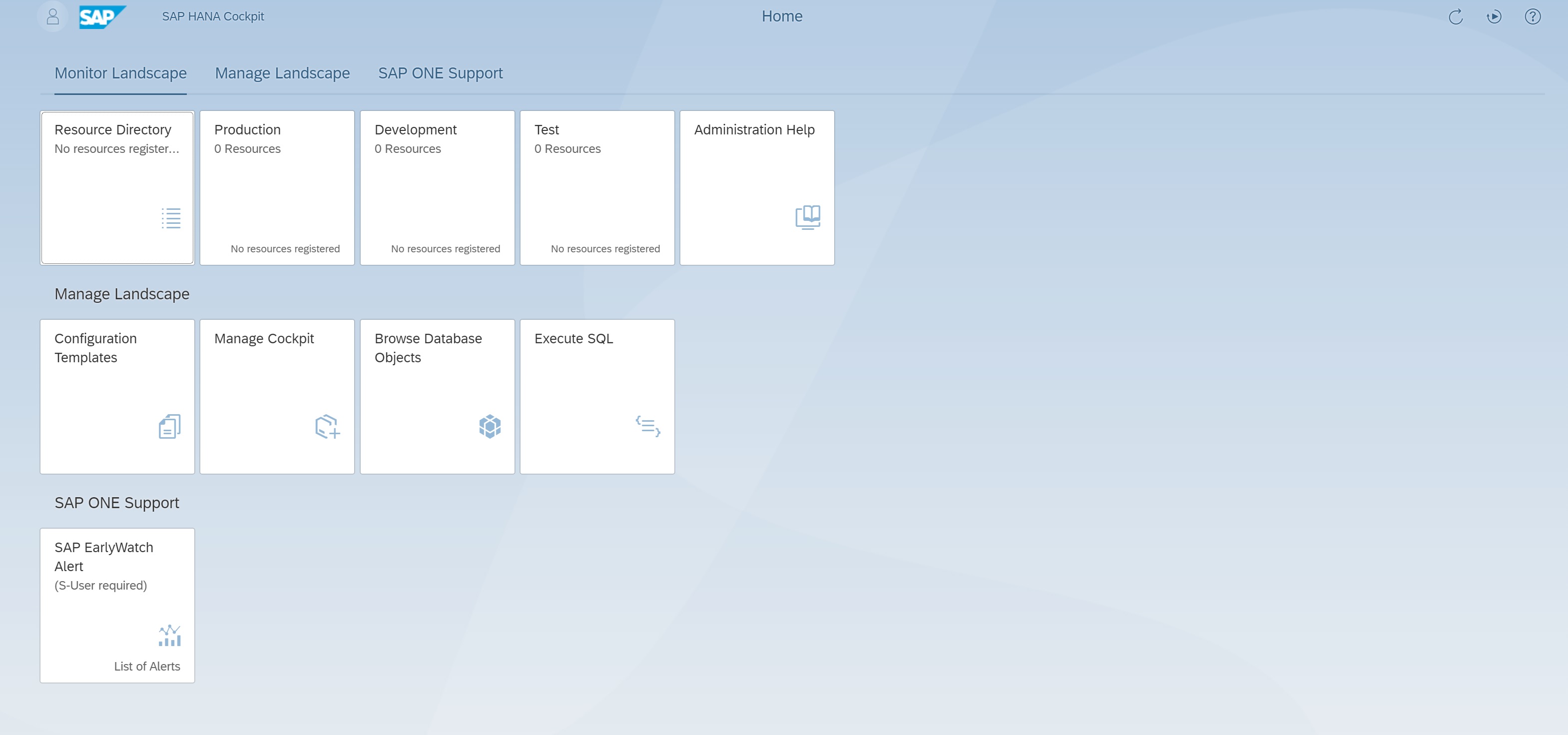 The Hana Cockpit use a fiori screen, here you have many options to view the system, if you notice there are three tabs Monitor landscape, manage landscape and SAP One support. Each of the tabs takes you to the specific fiori apps.