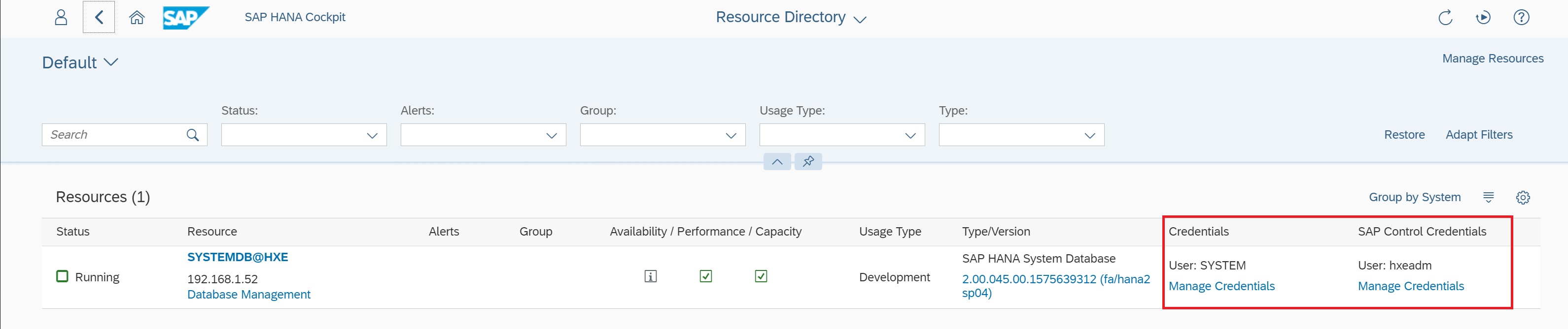Clicking on the SYSTEMDB@HXE link takes you to the database management screen, there are many areas you can select here, first create the credentials and SAP control credentials