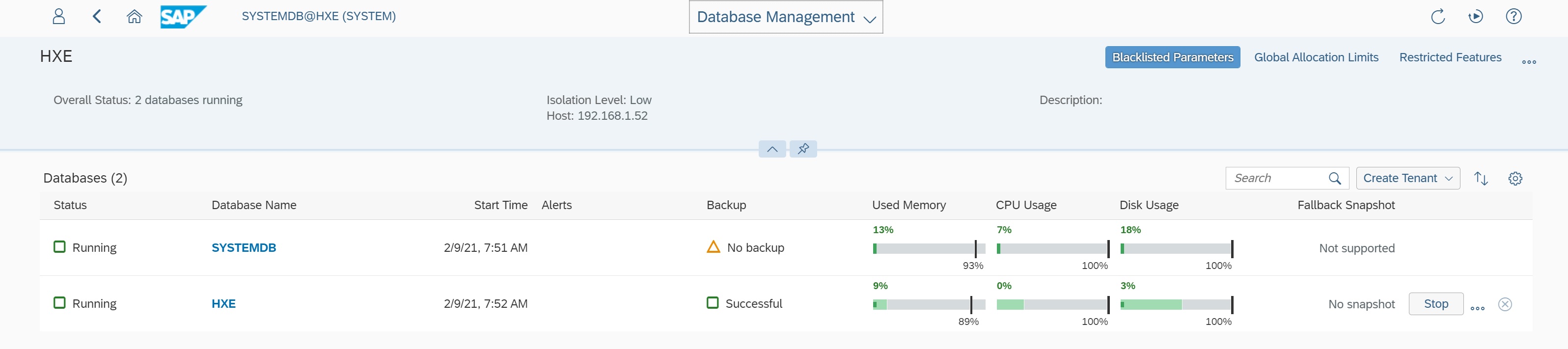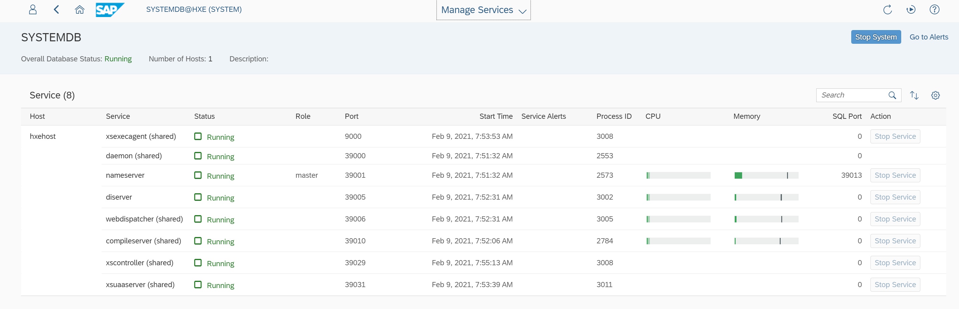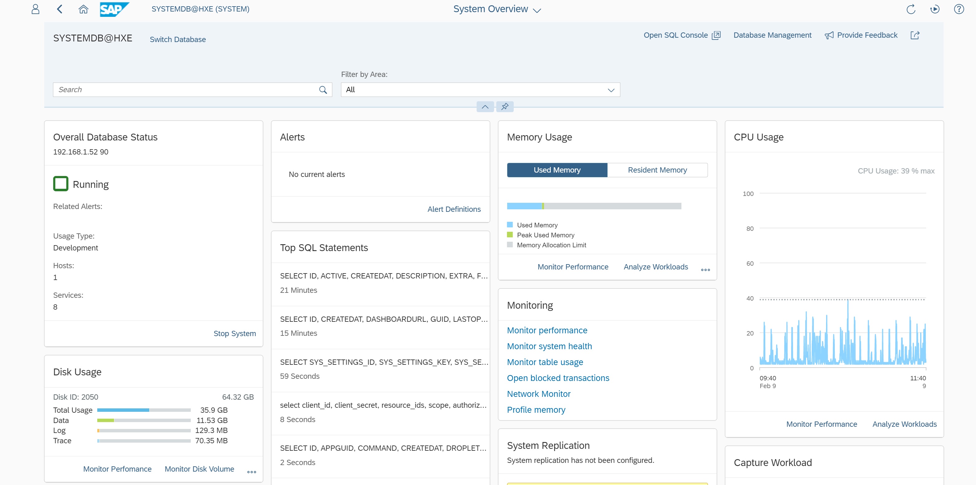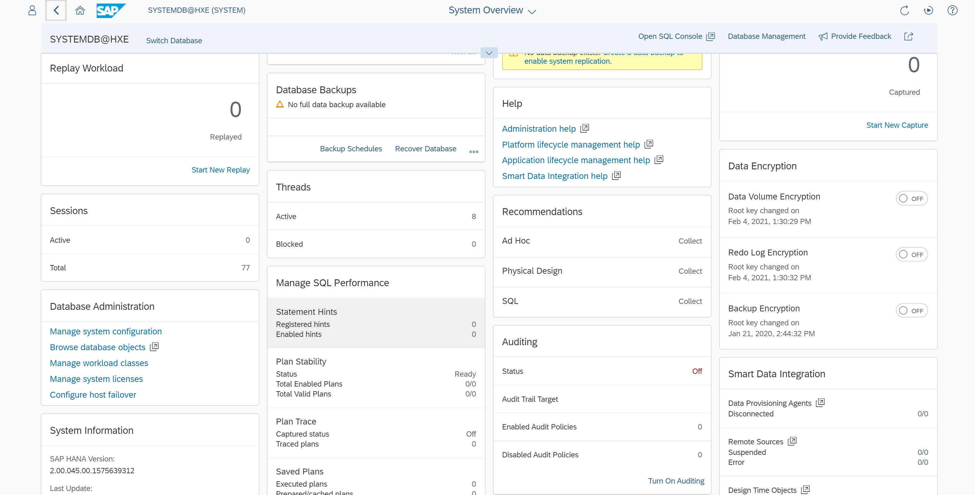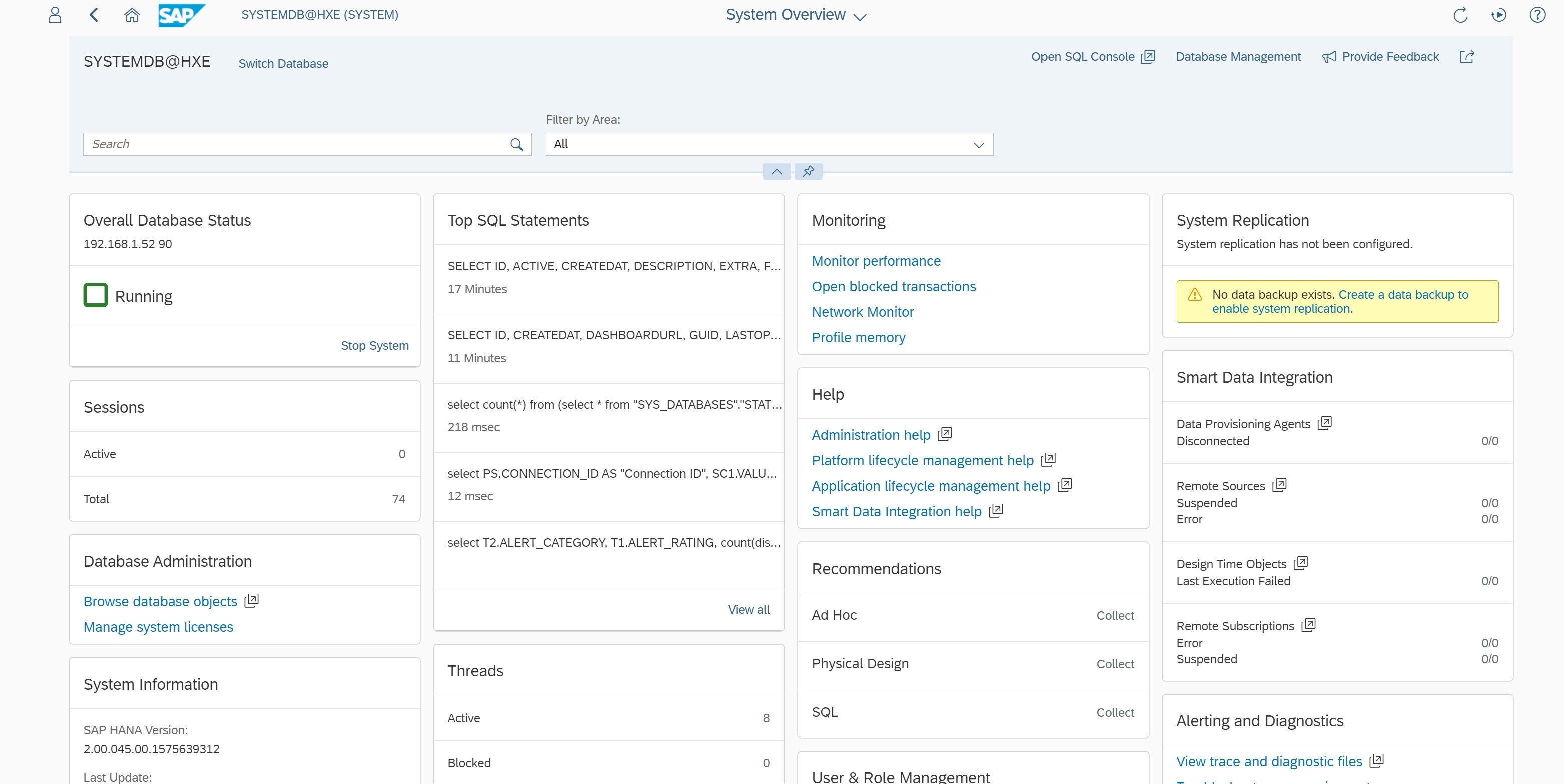 If you click on the systemdb@hxe icon you are taken to a screen that displays vasts amount of information regarding the database