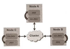 In Java EE accessing a server-side component almost always requires a JNDI lookup, JBoss provides a cluster-aware, high availability JNDI services called HA-JNDI that runs on top of the existing JNDI framework. The service provides client applications with the following features
