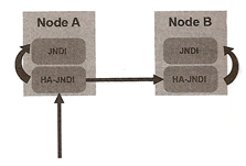 The below picture represent two nodes running a HA-JNDI and local JNDI service, when the client performs a EJB lookup on node A and node A HA-JNDI service doesn't have the EJB it calls the local JNDI service on node A, if this doesn't have the EJB then we then move on to the next node within the cluster trying to find the EJB, in the worst case you do not find the EJB will have to perform a HA-JNDI and local JNDI lookup on every node in the cluster.