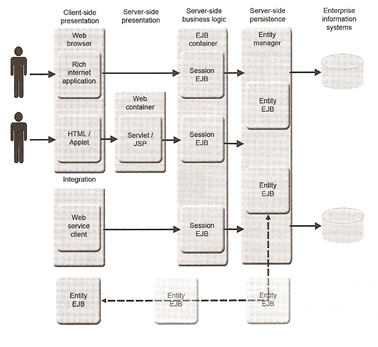 Many small web applications could use Tomcat which is a servlet/JSP container, this would be more than adequate. If the application is going to be large then you may want to separate the business logic from your web presentation code by pulling the logic out of your servlets, this means business logic can be used by multiple web applications. In the 90's the EJB (Enterprise Java Bean) specification was created in response to enable server-side application component development, the current release is now EJB3. In the beginning persisting data was a complex task, thus causing people to avoid EJB persistence altogether.