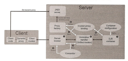 JBoss uses the new JBoss remoting framework to enable EJB remoting, as previously discussed an EJB client makes calls to a dynamic proxy that has been downloaded from a JNDI server,