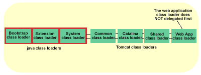 An important note is that the web application class loader does not use the delegation process that class loaders are encouraged to use. Instead, it tries to load classes first before the delegation. This allows web application to override classes in the shared and common class loaders on a per-web application basis.