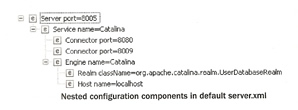 The default configuration is held in the file server.xml, the file consists of nested elements (components) that make up the Tomcat server, the nested configuration looks something like below