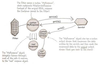 Response filters let us do something to the response output after the servlet has done it's thing and before the response is sent back to the client, however they are more complex to implement. A problem with changing the response is that the servlet output goes straight to the client and not back through the filter. You could implement your own response by making our own custom implementation of the HttpServletResponse interface and pass that to the servlet via the chain.doFilter() call, that custom implementation has to also include a custom output stream as well since that's the goal to capture the output after the servlet writes to it but before it goes back to the client.