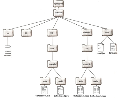 Below is the deployment environment, here I am using Tomcat deploying a web application involves both Container-specific rules and requirements of the servlet and JSP specification, everything below the coffeeV1 directory is the same regardless of your Container