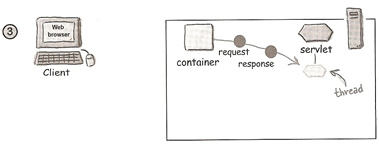 The servlet creates the request and response objects, creates or allocates a new thread for the servlet and calls the servlets service() method, passing the request and response references as arguements.