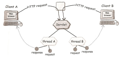 The container run multiple threads to process multiple requests to a single servlet, so each client gets a separate thread for each request and the Container allocates new request and response objects.