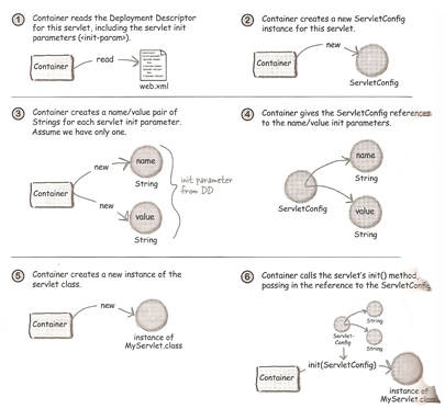 So to sum up there is only one ServletContext for an entire app and all the parts of the web app share it. But each servlet in the app has its own ServletConfig. The Container makes a ServletContext when a web app is deployed and makes the context available to each Servlet and JSP (which becomes a servlet) in the web app. You maybe asking yourself what not just use the <context-param>, this is up to you but you may want to hide certain information from certain servlets, in other words only restrict a particular servlet seeing a particular value. If you use the same name in a context init parameter and a servlet init parameter, nothing will happen because there's no name space conflict since you get the parameters through two different objects (ServletContext or ServletConfig).