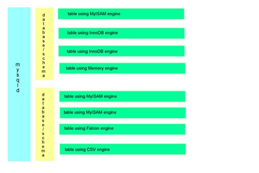 MySQL is very different from other databases, in that it's storage engine is pluggable, what I mean by this is that the MySQL server core code is separate from the storage engine, which means that you can have a pluggable storage engine that fits your application. MySQL has over 20 storage engines, here is a list of the common ones