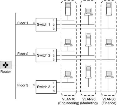In this figure, VLAN 10 (Engineering), VLAN 20 (Marketing), and VLAN 30 (Finance) span three floors of a building. If a member of VLAN 10 on Floor 1 wants to communicate with a member of VLAN 10 on Floor 3, the communication occurs without going through the router, and packet flooding is limited to port 1 of Switch 2 and Switch 3 even if the destination MAC address to Switch 2 and Switch 3 is not known.