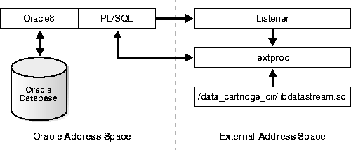 A call to a PL/SQL wrapper translates types, then the wrapper sends a signal across Oracle Net Services (ONS), ONS receives the signal and spawns or forks an extproc agent process. It is the extproc agent that accesses the shared library, it forks a RPC to the shared library, the shared library result is returned to the extproc agent by RPC, the agent then returns the result to the PL/SQL wrapper, the below diagram highlights the procedure used.