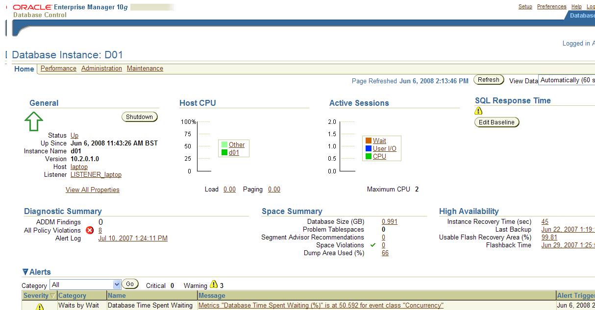 The main OEM page is displayed below, please refer to the oracle web site on how to navigate and what is available on the OEM.