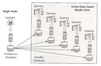 Active Data Guard also supports RAC, which means that you could have a single primary and a Active Data Guard Reader Farm