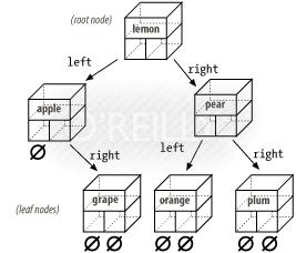 A tree is similar to a linked list, except that each element of a tree points to more than one other element. The simplest example of a tree is a binary tree. Each element of a binary tree, called a node, points to two other elements, called the left child and right child. Each of these children points to two children of its own and so on, the very last node are called leaf nodes.