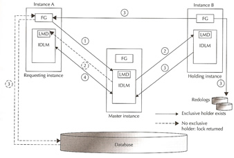 The transfer of a data block from instances buffer cache to another instances buffer cache is know as a ping. As mentioned already when an instance requires a data block it sends the request to the lock master to obtain a lock in the desired mode, this process is known as blocking asynchronous trap (BAST). When an instance receives a BAST it downgrades the lock ASAP, however it might have to write the corresponding block to disk, this operation is known as disk ping or hard ping. Disk pings have been reduce in the later versions of RAC, thus relaying on block transfers more, however there will always be a small amount of disk pinging. In the newer versions of RAC when a BAST is received sending the block or downgrading the lock may be deferred by tens of milliseconds, this extra time allows the holding instance to complete an active transaction and mark the block header appropriately, this will eliminate any need for the receiving instance to check the status of the transaction immediately after receiving/reading a block. Checking the status of a transaction is an expensive operation that may require access (and pinging) to the related undo segment header and undo data blocks as well. The parameter _gc_defer_time can be used to define the duration by which an instance deferred downgrading a lock.