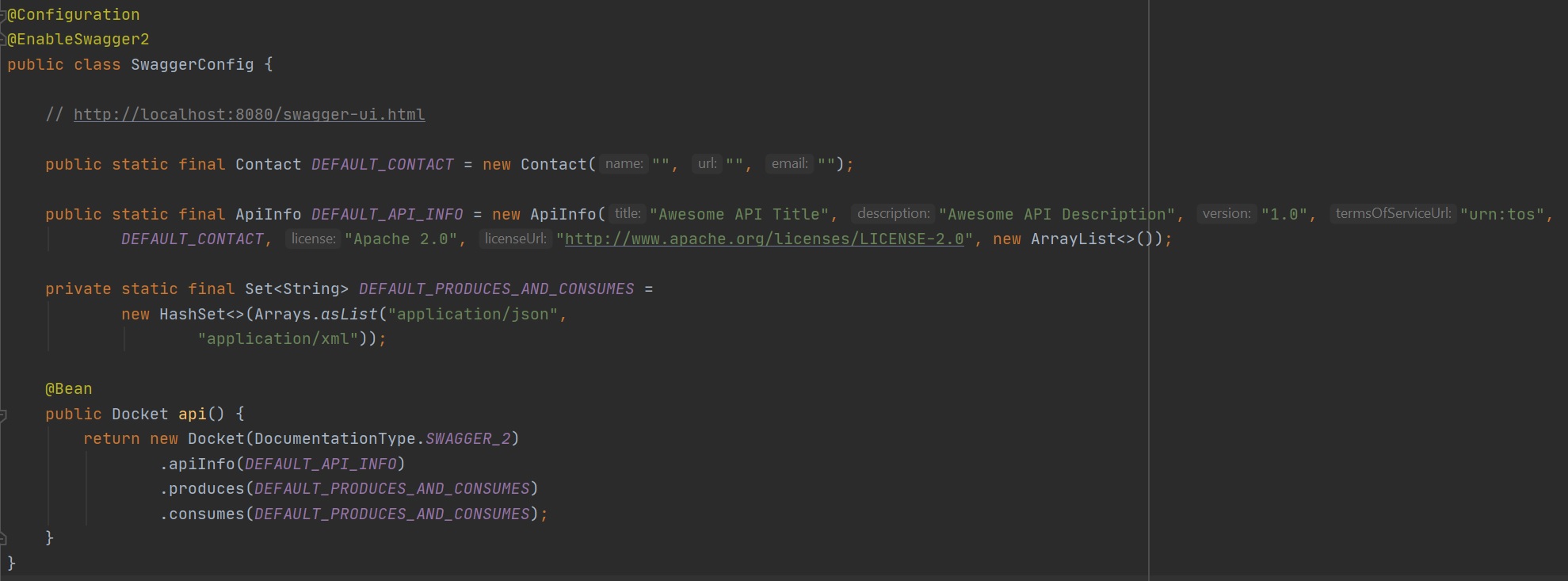 To enable swagger we create a configuration file using @Configuration and use the @EnableSwagger2 annotation, you can then create a Docket which affects the output, I have created default contact, default api info and the default producers and consumers.