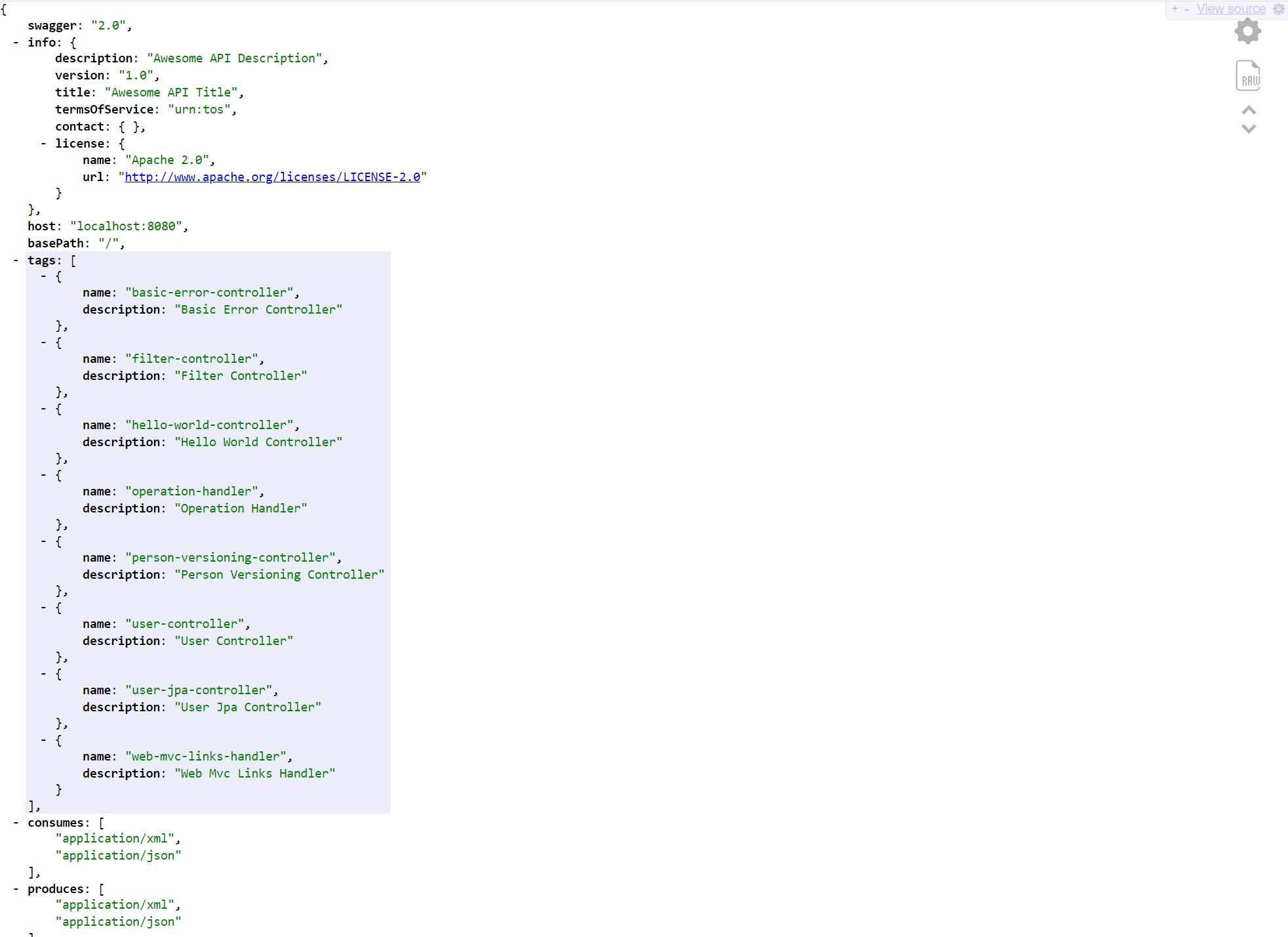 Start the application and using the URL http://localhost:8080/v2/api-docs displays the below, I do have a JSON pretty formatter installed in Chrome, this can then be used by other API clients.