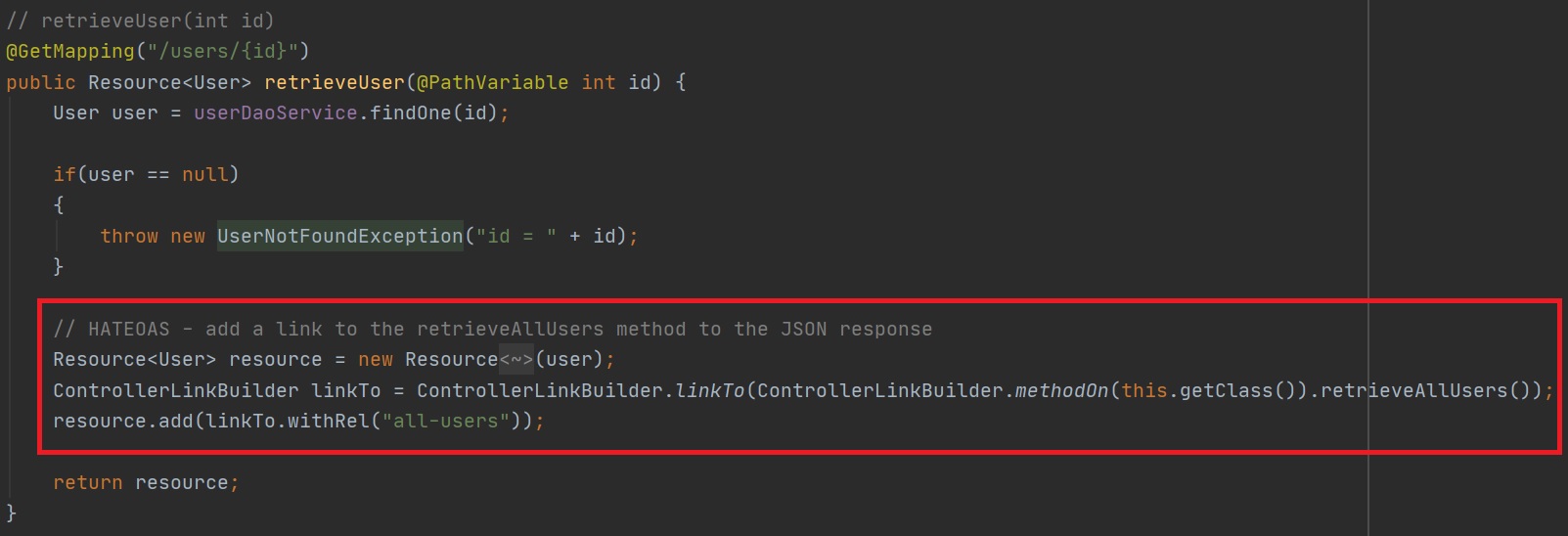 In the below example we configure HATEOAS in a controller method, we start by creating a HATEOAS resource around the user object, next we can add links to the resource, we use the ControllerLinkBuilder to create a link to a method in this case the retrieveAllUsers() method, lastly we when add the link we just created to the resource, we also give the link a name in this case "all-users"
