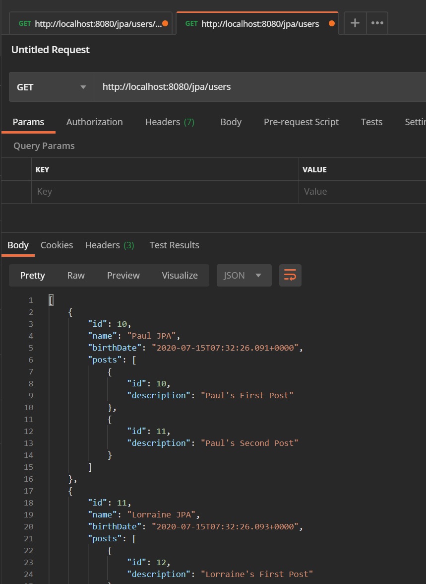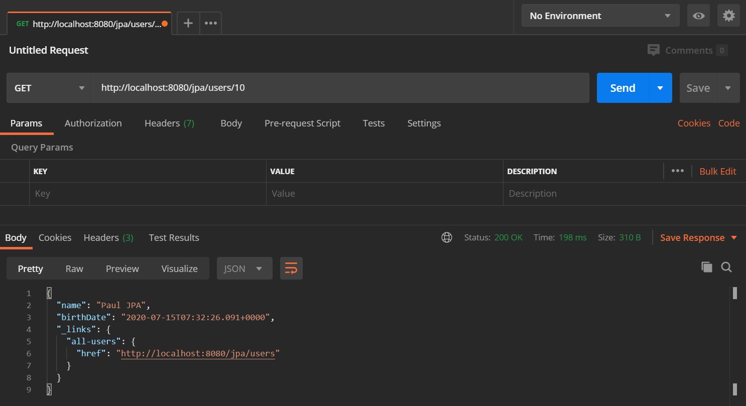We can then use postman to display the data with the HATEOAS link, as you can see below we have the all-users link pointing to a href that will execute the retrieveAllUsers method in the controller.