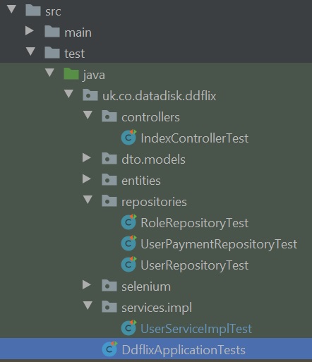 When you create a project with Intellij a test directory structure is created for you, as you create the tests you will see something similar to below