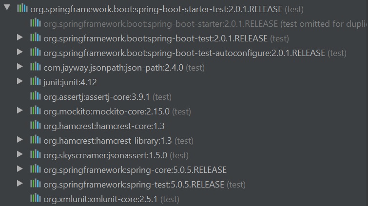The spring-boot-starter-test dependency (left-hand screenshot) will pull in a numbert of packages (right-hand screenshot) most of which I commented on earlier in this section.