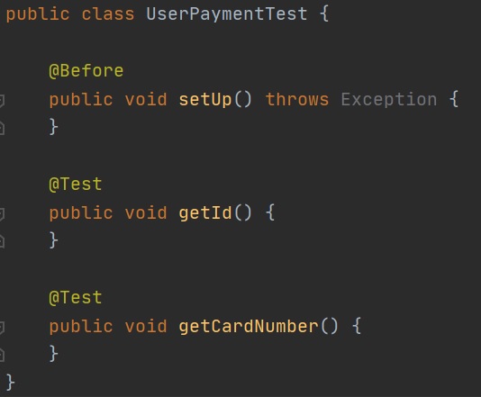 Most IDE's can easy create the basic test file and structure for you, you can see Intellij's wizard on creating a test for the UserPayment class (left-hand screenshot), there are a number of options, you can use different testing libraries Junit4, JUnit5, TestNG, etc. You can also setup @Before and @After methods and then select what test methods you required based on the members of that class. Intellij then creates a bsic test file for you in the correct directory in the test directory. At this point you can now inject any services that you need and add any test code.